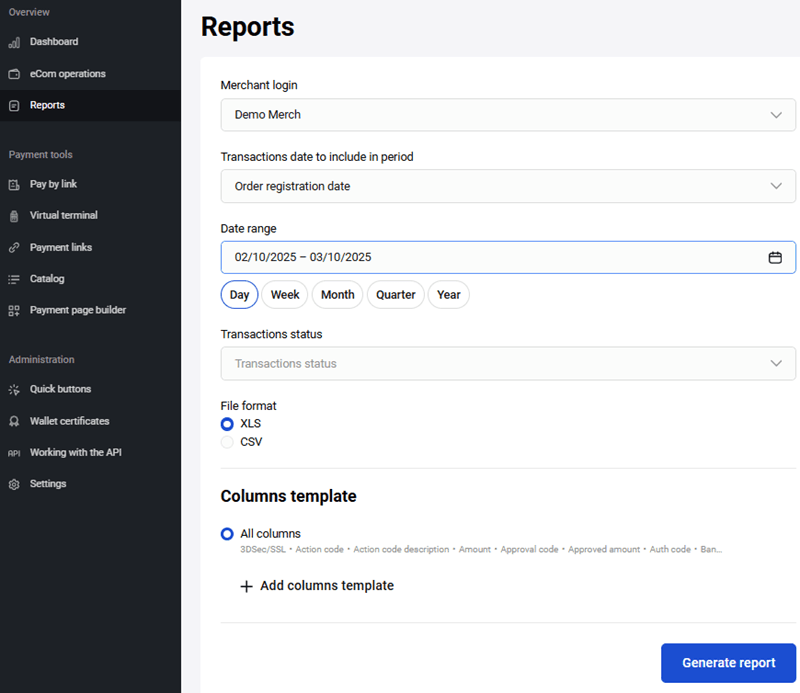 - In the Request creation section, specify the start and end dates of the period for which you want to get the transaction register.