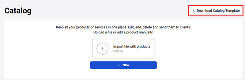 Then upload the completed catalog in .CSV format by clicking Import file with products: