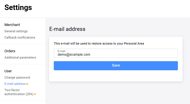 | The merchant's email address to which notifications will be sent. You can enter more than one email address in this field (separated by commas). The triggers for notification dispatch are configurable. They can be set up for such events as change of transaction status, creation of a binding, etc. | |