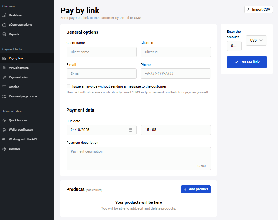 After uploading the catalog or product it will be available to add items from the catalog to the invoice. For more information on adding items from the catalog, please see the Pay by link section.