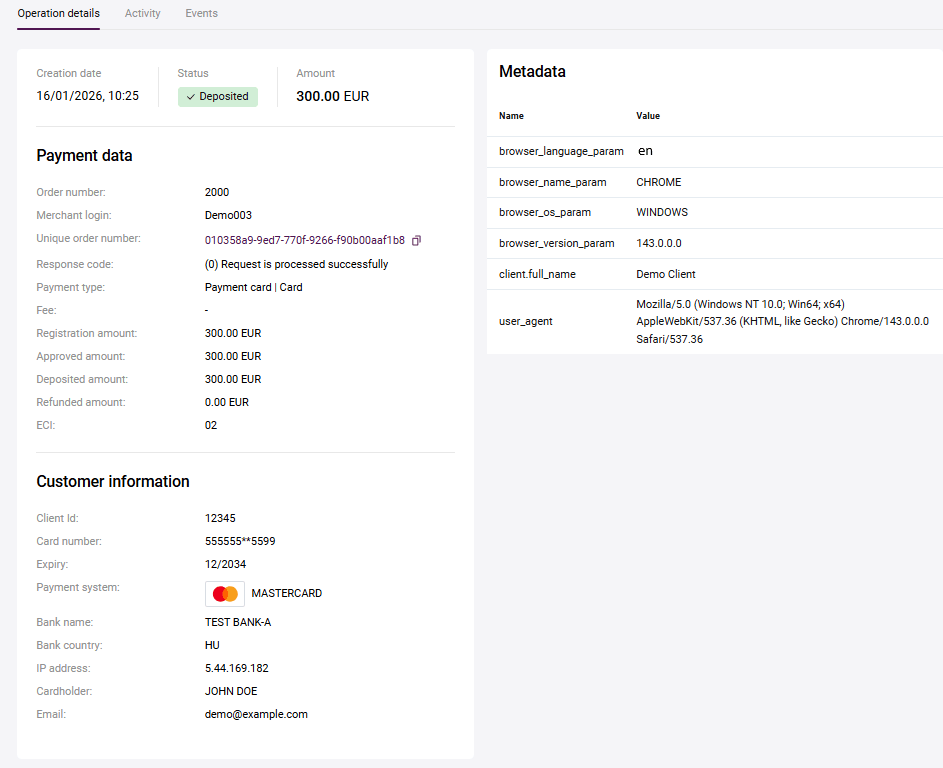 Check the data, change it if necessary and click on the Confirm button. After the completion, the order gets Deposited status.