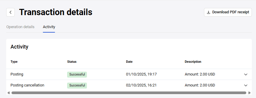 08.01.2020;23:32:06;кредит;8690,30;840;-260,71;8429,59;411111**4111;MASTERCARD;000889106664;27030220;TEST;163096;;6f608d5d-9161-79a3-8b3a-03db00a2a8a0File header - contains general information about transactions for the selected period. The main content of the file is information on each transaction.