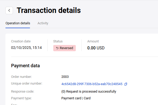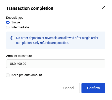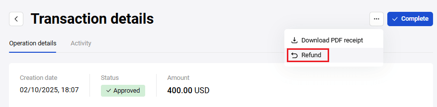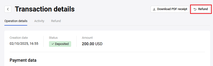 - In case of orders without a shopping cart in the Deposited status, the Refund button opens the refund confirmation window.