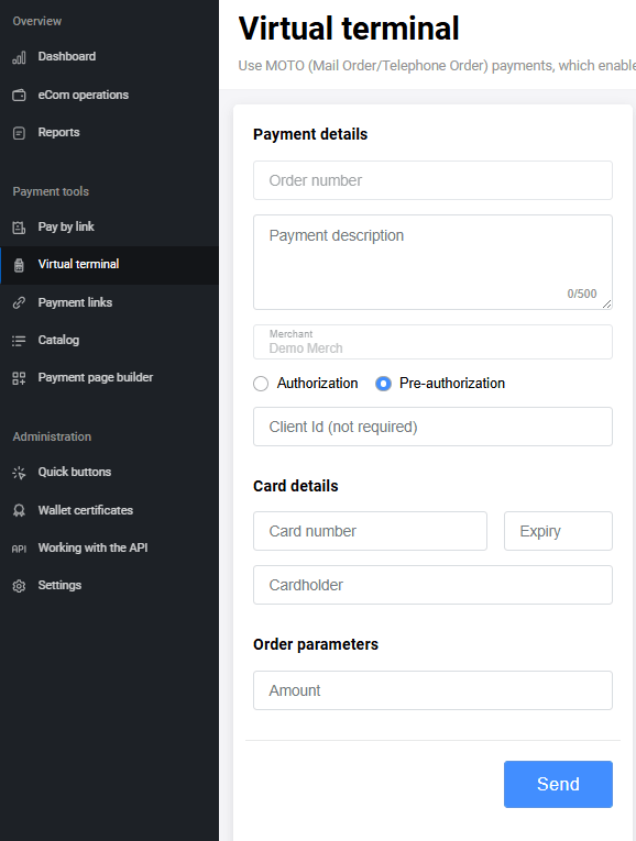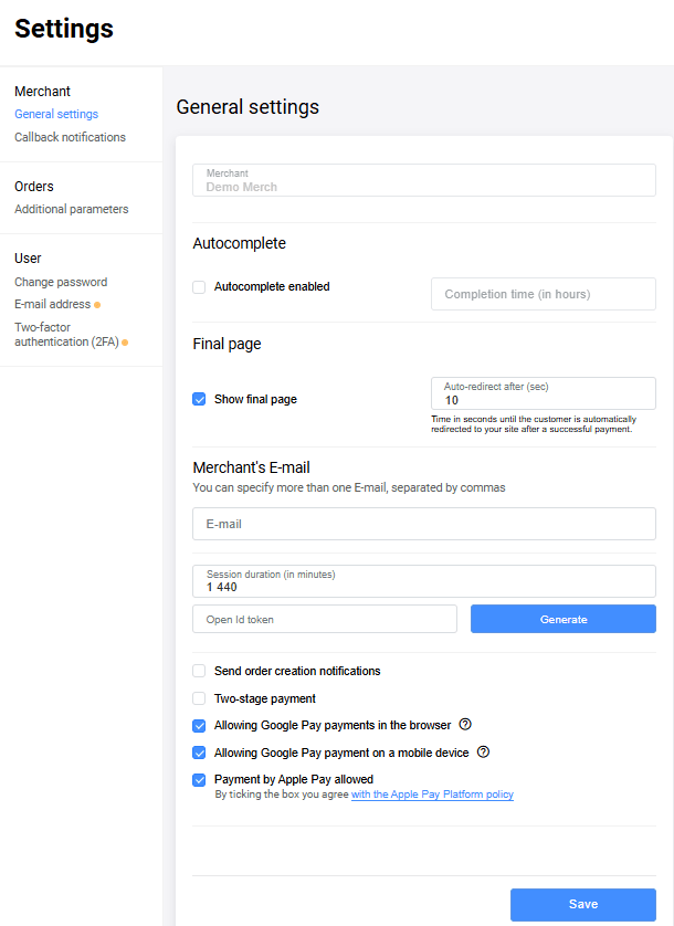 | Autocomplete enabled | If enabled, allows you to specify in the Completion time (in hours) the number of hours after which two-stage payments will be automatically completed |