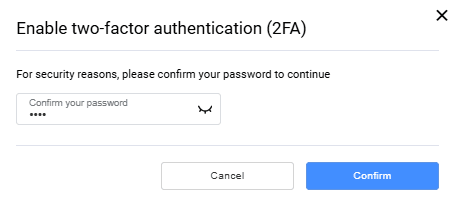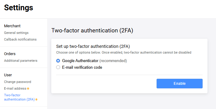 To set up two-factor authentication, in the navigation bar to the left, go to Settings > Two-factor authentication (2FA). The page provides two options for setting up two-factor authentication: