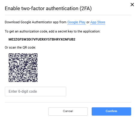 - Download and open Google Authenticator application on your device. Enter a secret key or scan the QR-code to add your account to Google Authenticator application. The application generates a code. Enter the generated code into the Enter 6-digit code field.