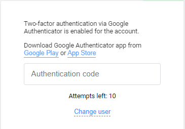 - Once two-factor authentication via Google Authenticator is enabled, at the next logons to your Personal Area, you are asked to enter Google Authenticator code: