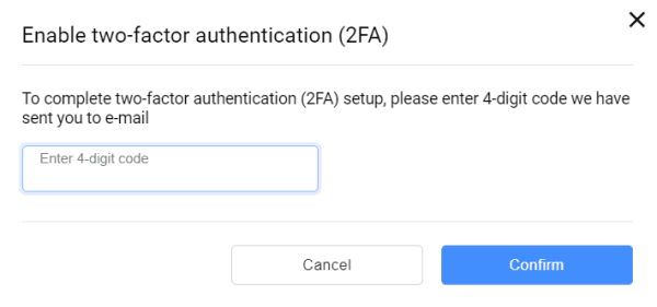 - Once two-factor authentication via E-mail is enabled, at the next logons to your Personal Area, you are asked to enter 4-digit code sent to your e-mail address.