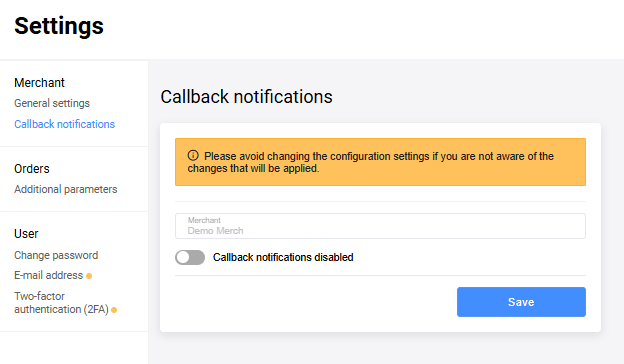 More information about callback notifications is available here. The Callback notification settings tab is located under Settings → Merchant → Callback Notifications.