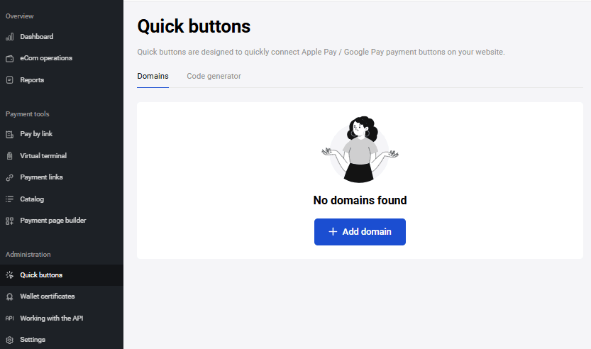 The Quick buttons section provides a quick way to connect Apple Pay / Google Pay payment buttons on your website. To access the Quick buttons section, click