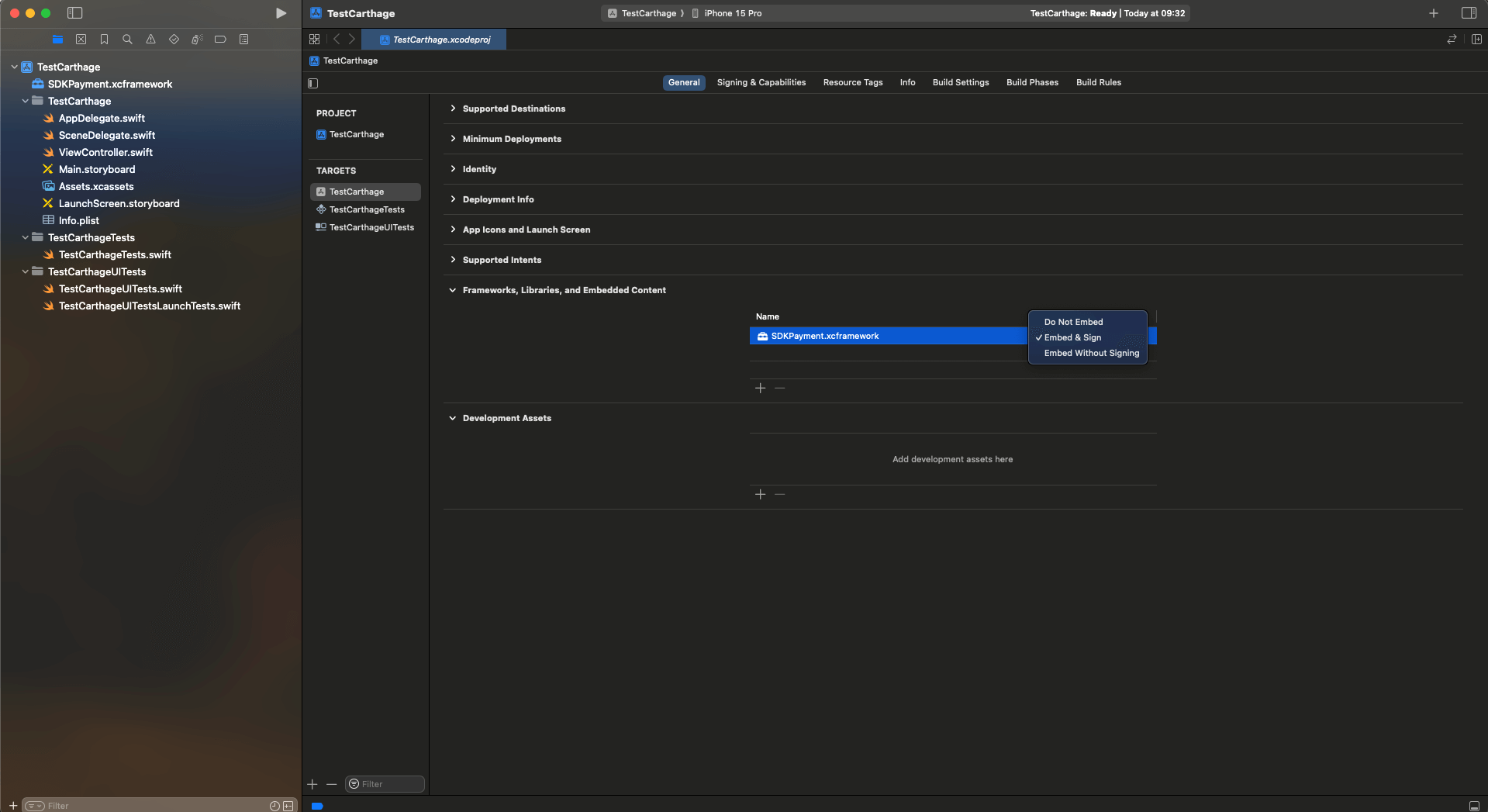 SDKCore.frameworkandSDKForms.framework, in the Embed column, changeDo not EmbedtoEmbed & Sign.