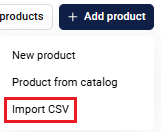 You can register an order (invoice) with a shopping cart and this cart can be populated automatically from a CSV file. To upload cart automatically, click on the Add product button and select Import CSV. In the window that opens, select the file to be uploaded on your device.