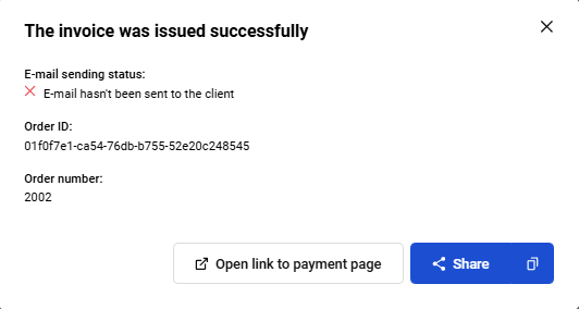 Go to the payment page by clicking on the Open link to payment page button in the invoice-issued-successfully message.