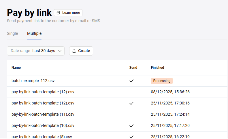 A new line with the uploaded file appears in the list of processed files. While the file is being generated, the "Processing" status is displayed in the Finished column. When the file is processed, this column displays the date and time when the file was processed. The Send column contains a checkmark if the payment links have been sent to the customers.