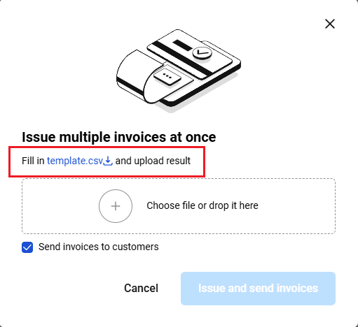 Choose the file or drag and drop it to the corresponding fields. If you want the payment links to be sent immediately to the customers, check the Send invoices to customers box, and then click Issue and send invoices. Otherwise, clear the Send invoices to customers box and click Issue invoices.