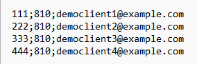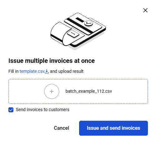 If you have an appropriate permission, you can send multiple invoices at once to the customers by uploading a CSV file with invoice data and e-mails. The file format is defined by a template that is configured by the support team.