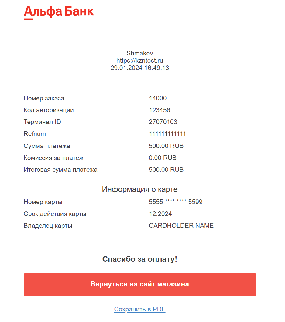 Click the Pay by card. To confirm the transaction, use the 3-D Secure code specified for the test card.