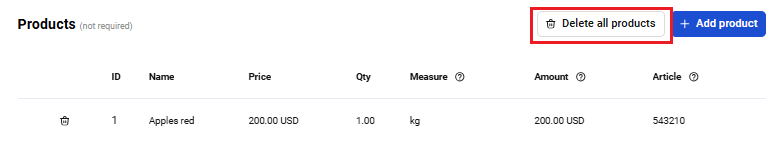 Field Description Name Product/service name. Mandatory field. Article The vendor code of the product. Mandatory field. Qty The number of units of the product. Mandatory field. Measure Units of measurement, for example: L – liters, pcs. – pieces. Mandatory field. Price Price of one product unit. Mandatory field. Amount Total amount for all units of one product item. Calculated automatically when filling in the Price and Qty fields. Click Add product.