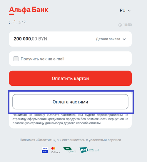 На платежной странице клиент нажимает кнопку Оплата частями.