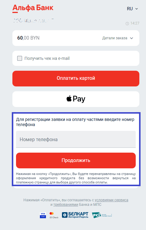 Открывается поле для ввода номера телефона для регистрации заявки на оплату частями.