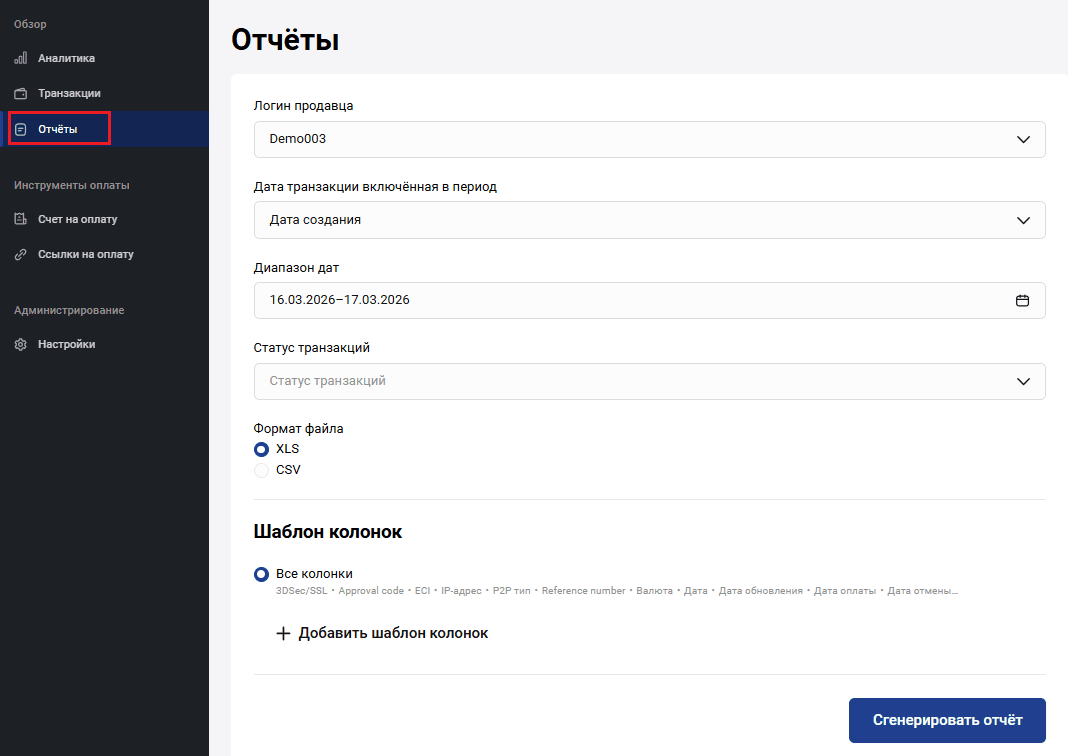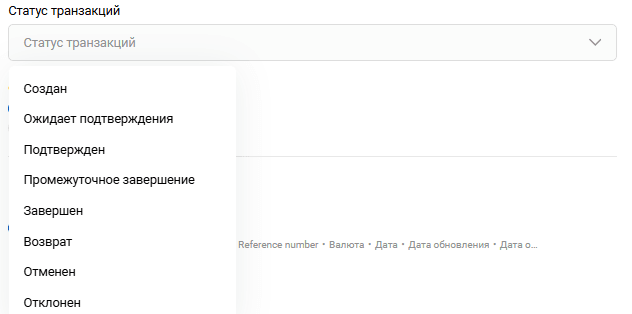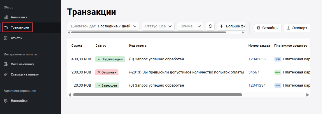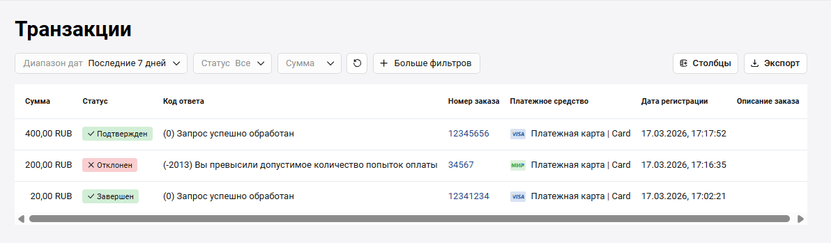 Раздел Реестр транзакций позволяет выгрузить сведения о транзакциях из процессинга. Чтобы попасть в раздел Реестр транзакций, нажмите
