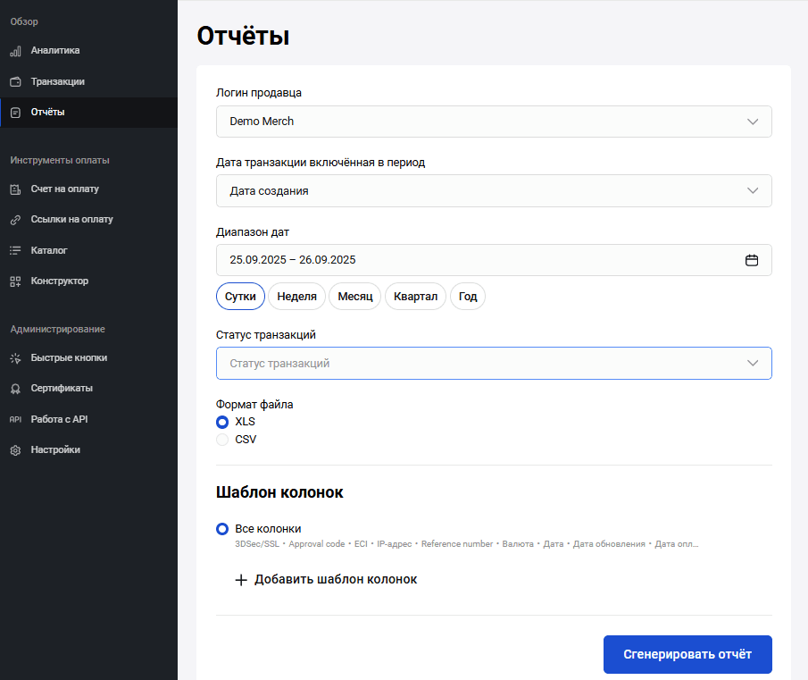 Чтобы получить реестр транзакций за определённый период, выполните следующие действия:
