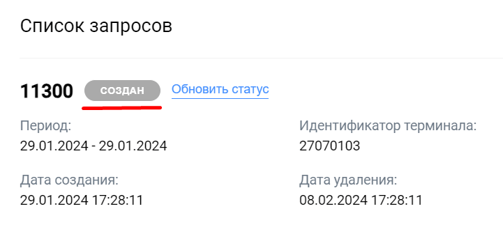 - Нажмите на Создать запрос. Сразу после создания реестр имеет статус Создан. Через некоторое время в секции Список запросов отобразится созданный запрос: