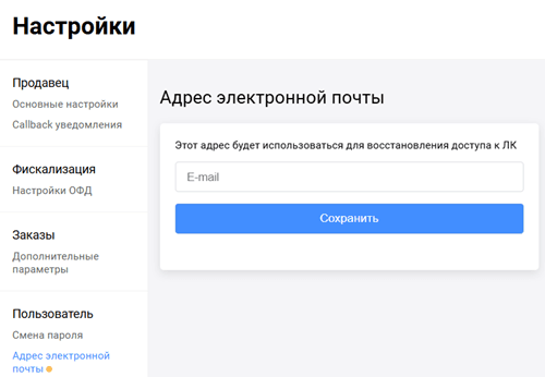 Задайте адрес электронной почты, который будет использоваться для восстановления доступа к личному кабинету.