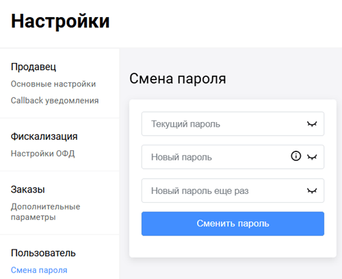 - Пароль не должен содержать названия магазина или логина одного из пользователей, привязанных к мерчанту, к которому относится пользователь, изменяющий пароль (включая изменение регистра).