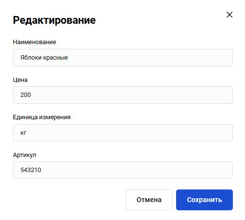 При нажатии кнопки редактирования откроется форма для изменения товара: