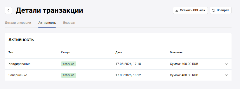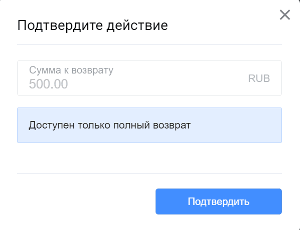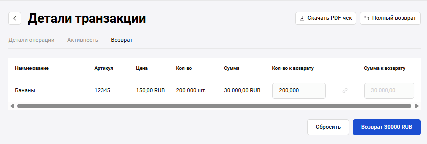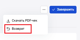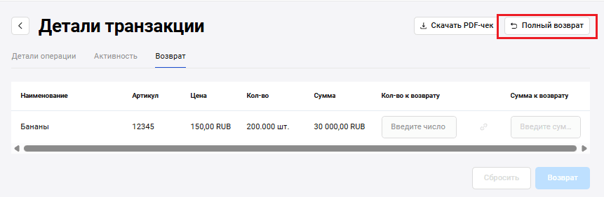 Возврат осуществляется на странице информации о транзакции с помощью кнопки Возврат.