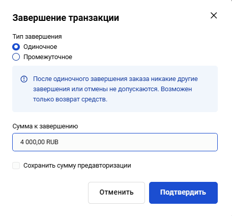 | Автозавершение включено | Если включено, позволяет указать в поле Время завершения количество часов, по истечении которых двухстадийные платежи будут автоматически завершены. |