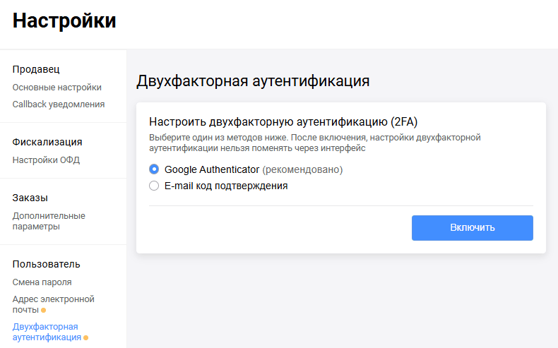 Для настройки двухфакторной аутентификации в панели управления слева перейдите в раздел Настройки > Двухфакторная аутентификация. На выбор предлагается два способа аутентификации: