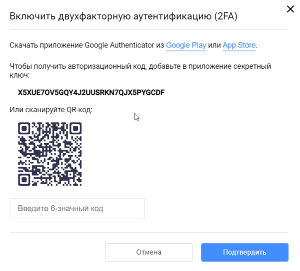 Вы можете настроить двухфакторную аутентификацию, чтобы обеспечить дополнительный уровень безопасности, гарантирующий, что только вы сможете иметь доступ к вашему Личному кабинету. В этом случае при входе в Личный кабинет необходимо ввести не только логин и пароль, но и код аутентификации, сгенерированный приложением Google Authenticator, либо отправленный на вашу электронную почту (в зависимости от включенного способа аутентификации).