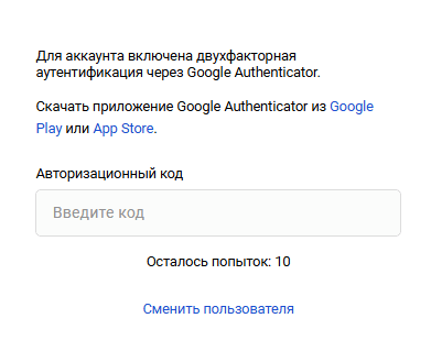 - После того, как вы настроите двухфакторную аутентификацию через Google Authenticator, при следующих входах в ваш Личный кабинет будет запрашиваться код Google Authenticator:
