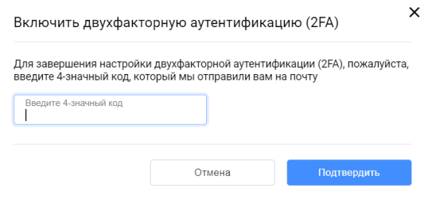 - Для завершения настройки двухфакторной аутентификации, пожалуйста, введите 4-значный код, отправленный вам на ваш адрес электронной почты: