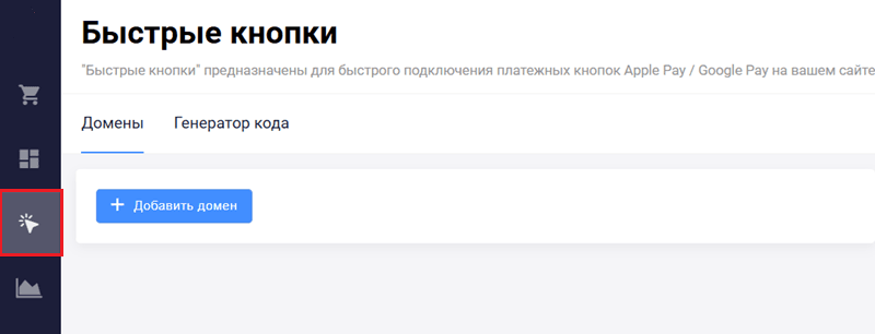 Раздел Быстрые кнопки позволяет быстро подключить кнопки для оплаты по Apple Pay / Google Pay на вашем сайте. Чтобы открыть раздел Быстрые кнопки, нажмите
